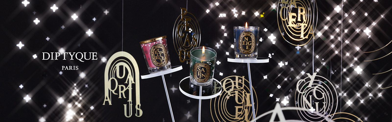 Rediscover the wonder of a starry Holiday night with Diptyque's artistic map of stars. Diptyque's dancing letters magically draw the sky map for an enchanted holiday season, head in the stars.