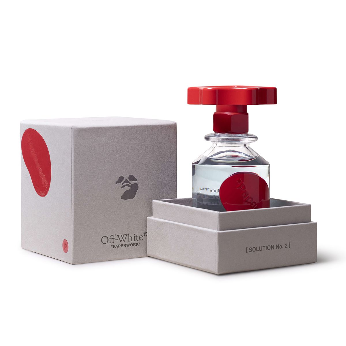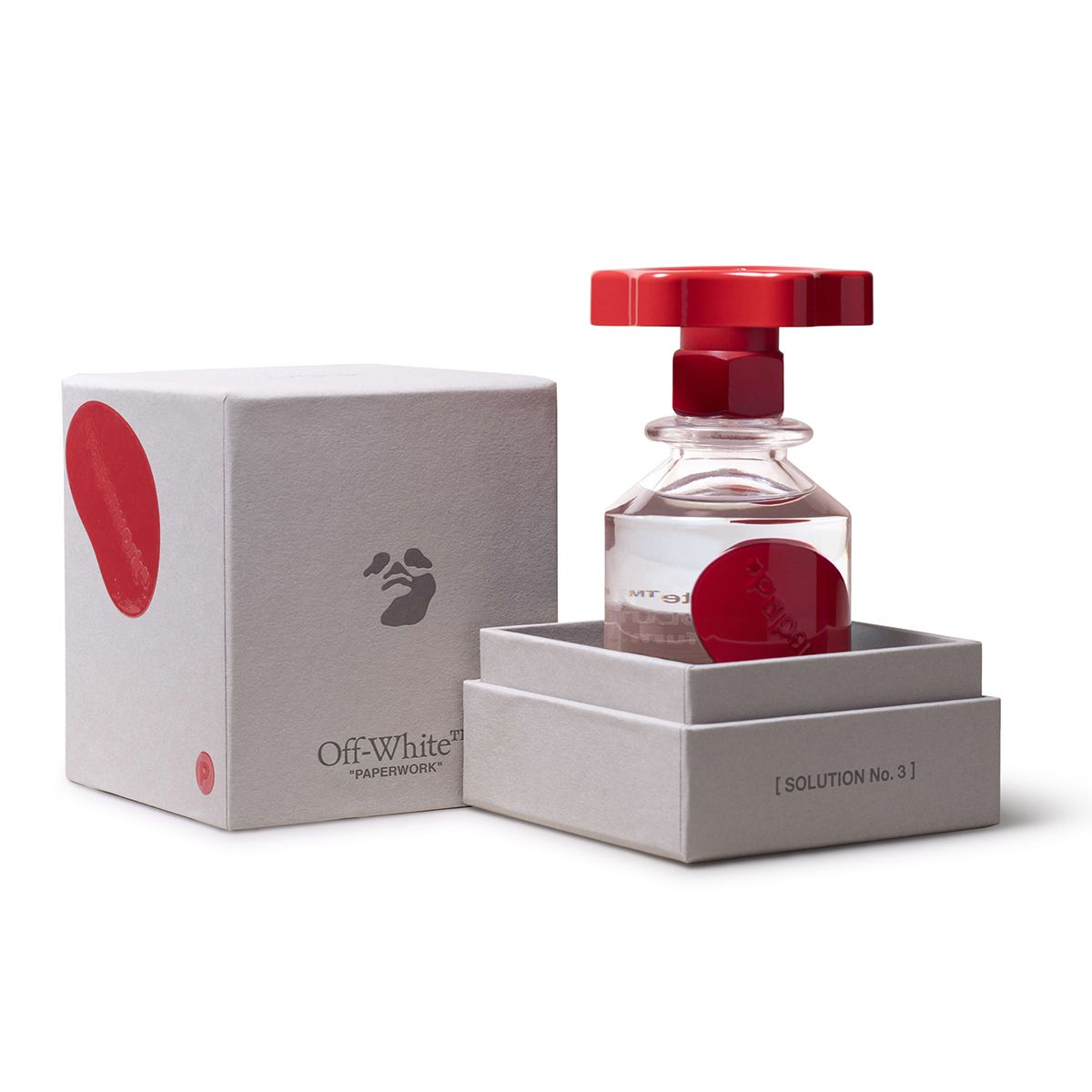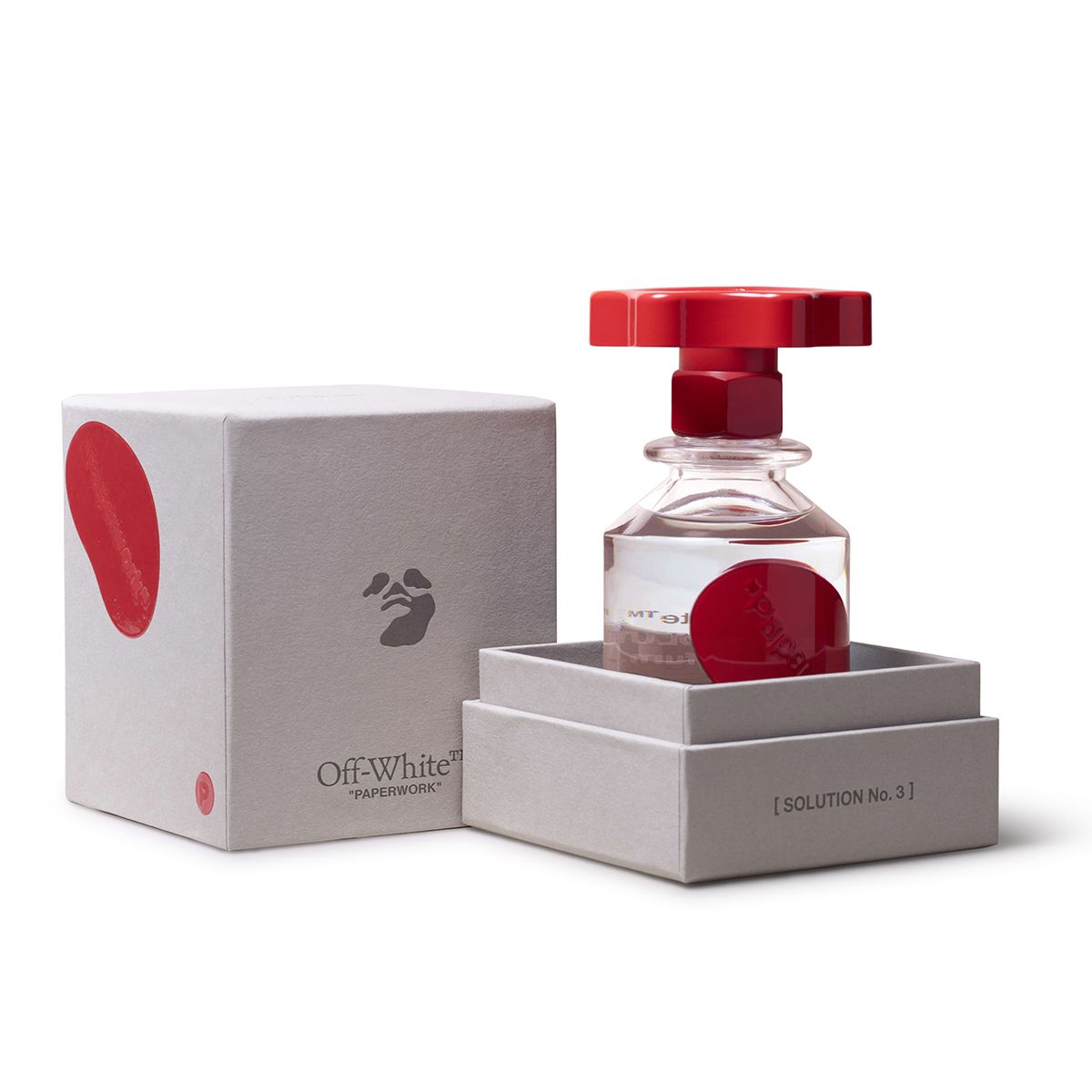 Both the use of “Solution” for the fragrance names and the collection’s packaging evoke Abloh’s essential interest in and reconception of industrial manufacturing processes. Specifically, the bottles are formed from industrial glass made-in-Italy by Bormioli and topped with grip control knobs: replicas of the handles that close the vats found in industrial fragrance facilities.