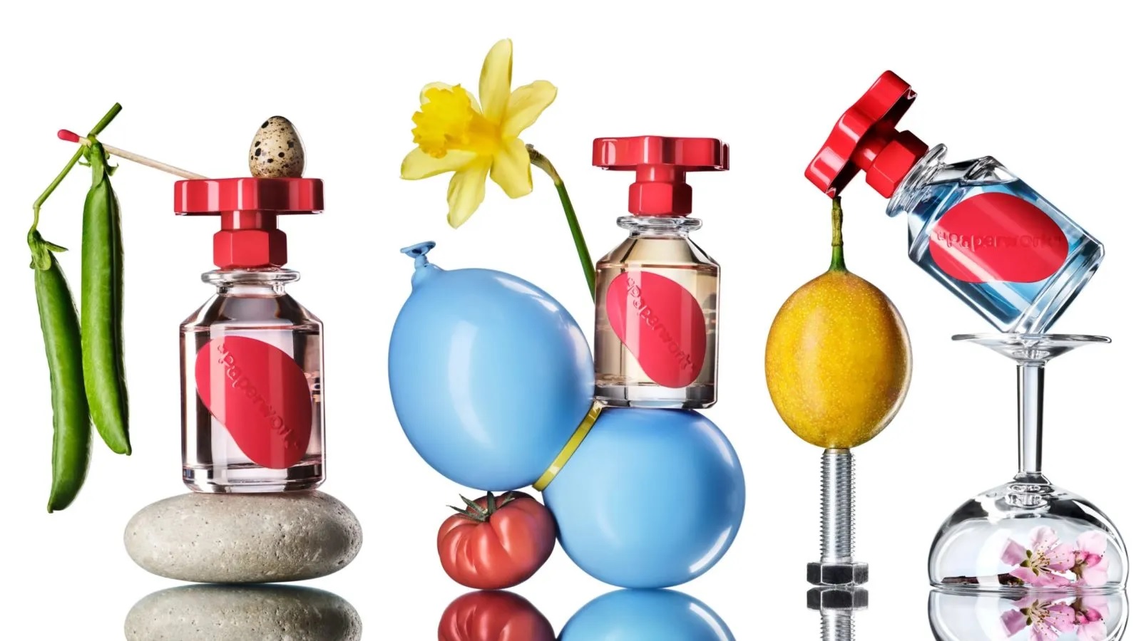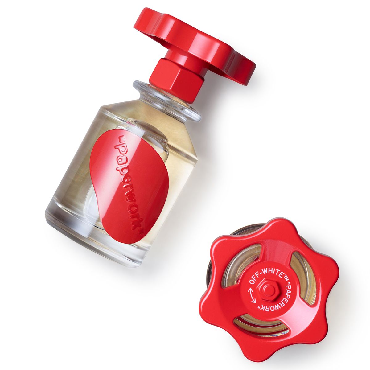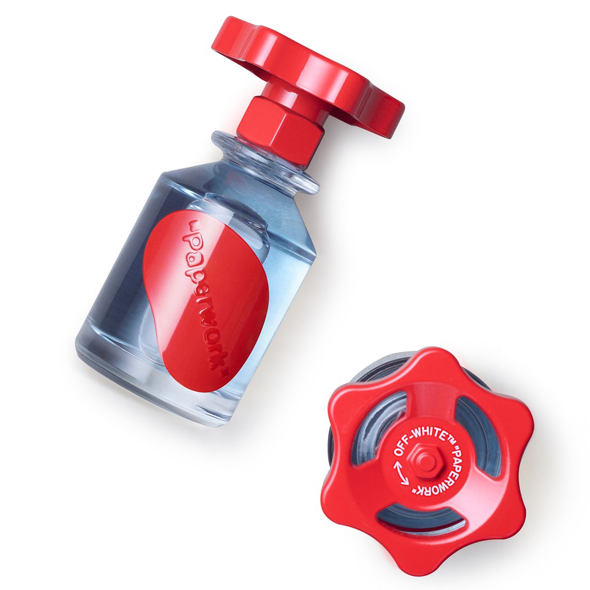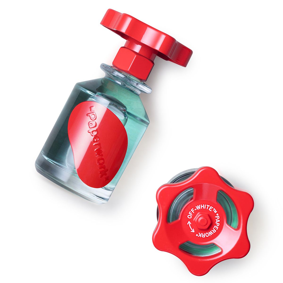 Both the use of “Solution” for the fragrance names and the collection’s packaging evoke Abloh’s essential interest in and reconception of industrial manufacturing processes. Specifically, the bottles are formed from industrial glass made-in-Italy by Bormioli and topped with grip control knobs: replicas of the handles that close the vats found in industrial fragrance facilities.