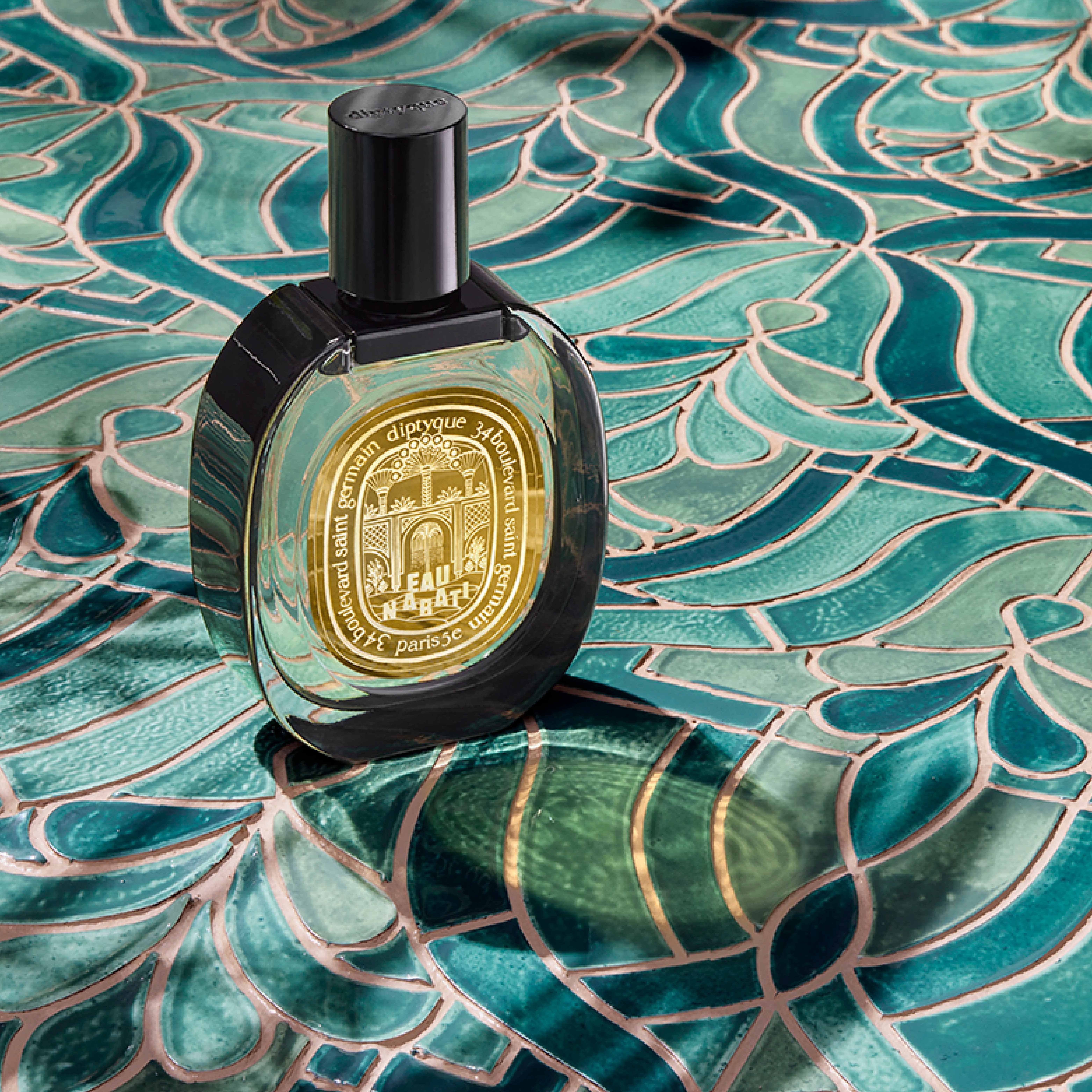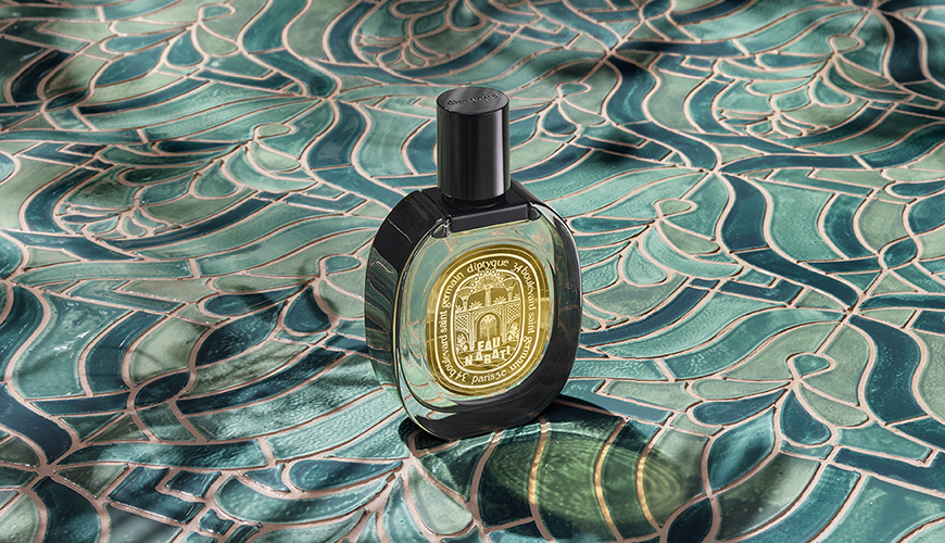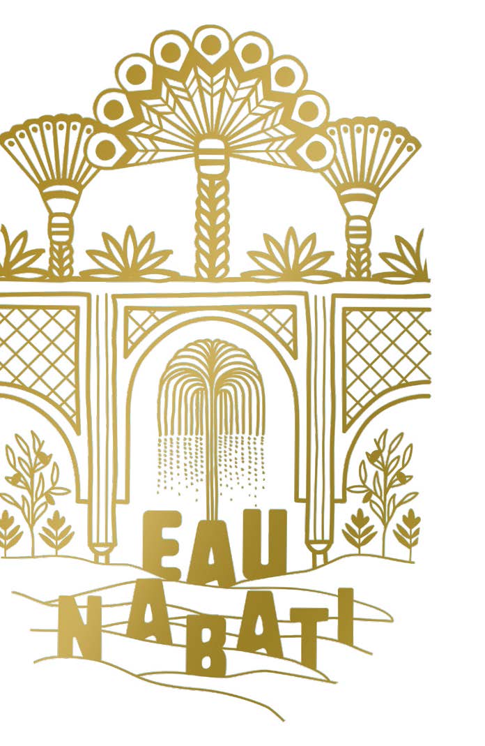 Beyond the sand dunes in the forefront, a fountain surmounted by palm trees beckons us to rest awhile and explore. The promenade of the imagination can begin. On the reverse, the interior of the garden of paradise is majestically revealed. And now the garden has a fragrance and a name. Eau Nabati is an olfactory translation of an idealized stroll through the very heart of a lush natural setting, miraculous and delicate.